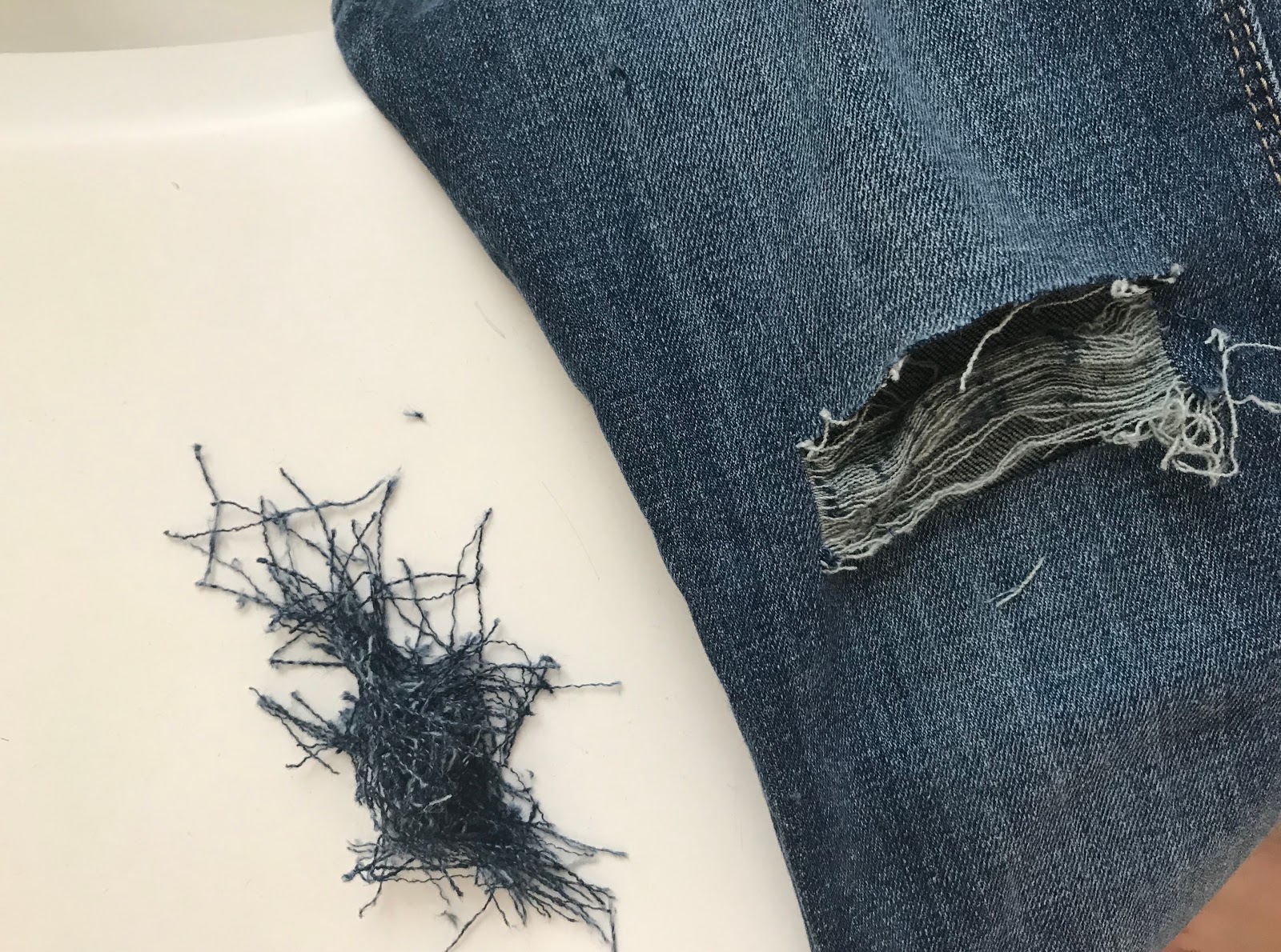 Step 5: Once you’ve frayed the ends, you will be able to see the blue fiber ends. Use a pair of tweezers to pull the blue fibers out. This is the time-consuming part. I recommend you do this part in your bathroom or somewhere you can easily clean it up because it gets a little messy.