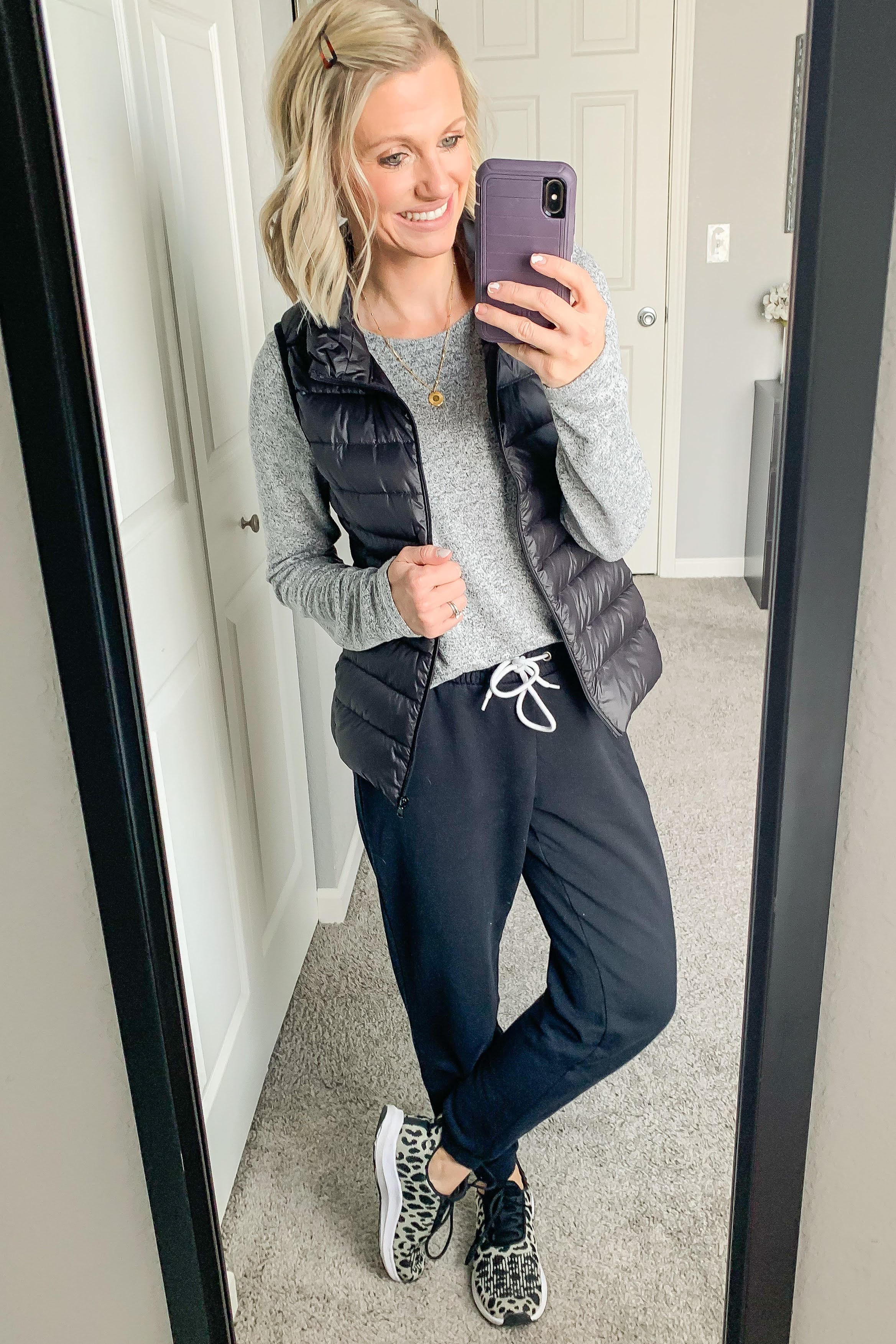 Joggers- Old Navy (exact) || Top- Old Navy (similar) || Vest- Goodwill (similar) || Shoes- Walmart (similar)
