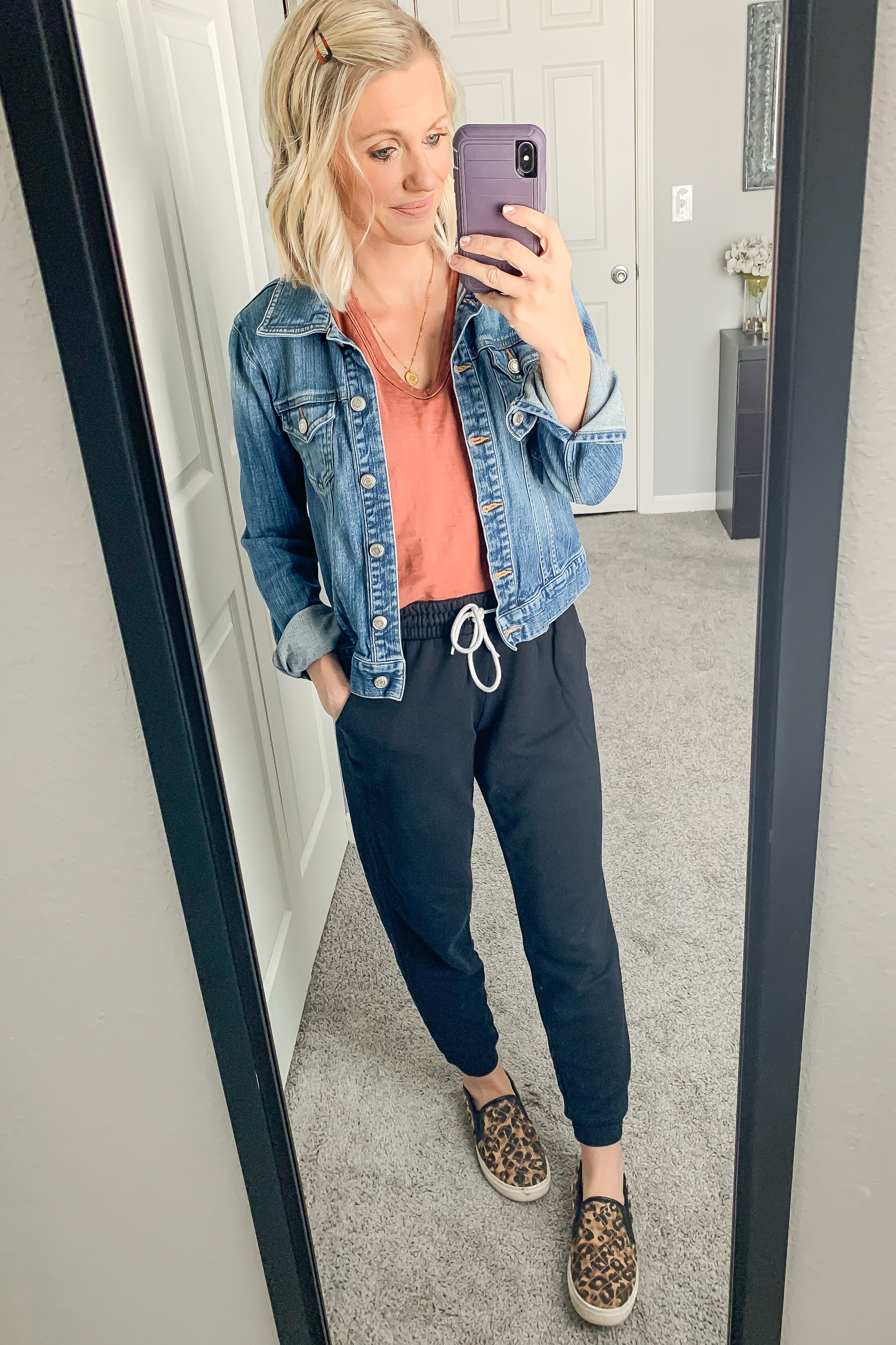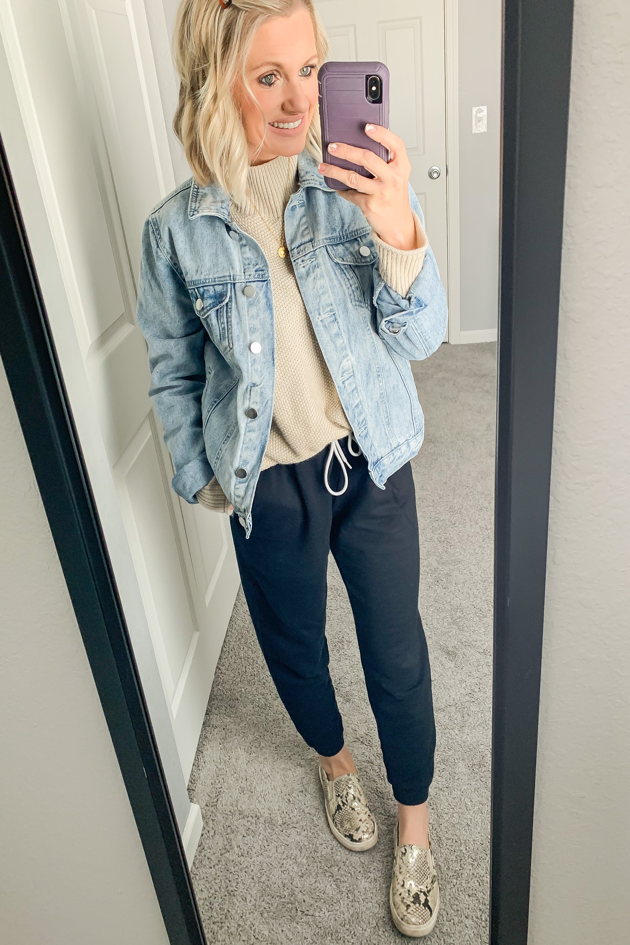 Joggers- Old Navy (exact) || Top- Target (exact) || Denim Jacket- Old Navy (similar) || Shoes- Walmart (similar)