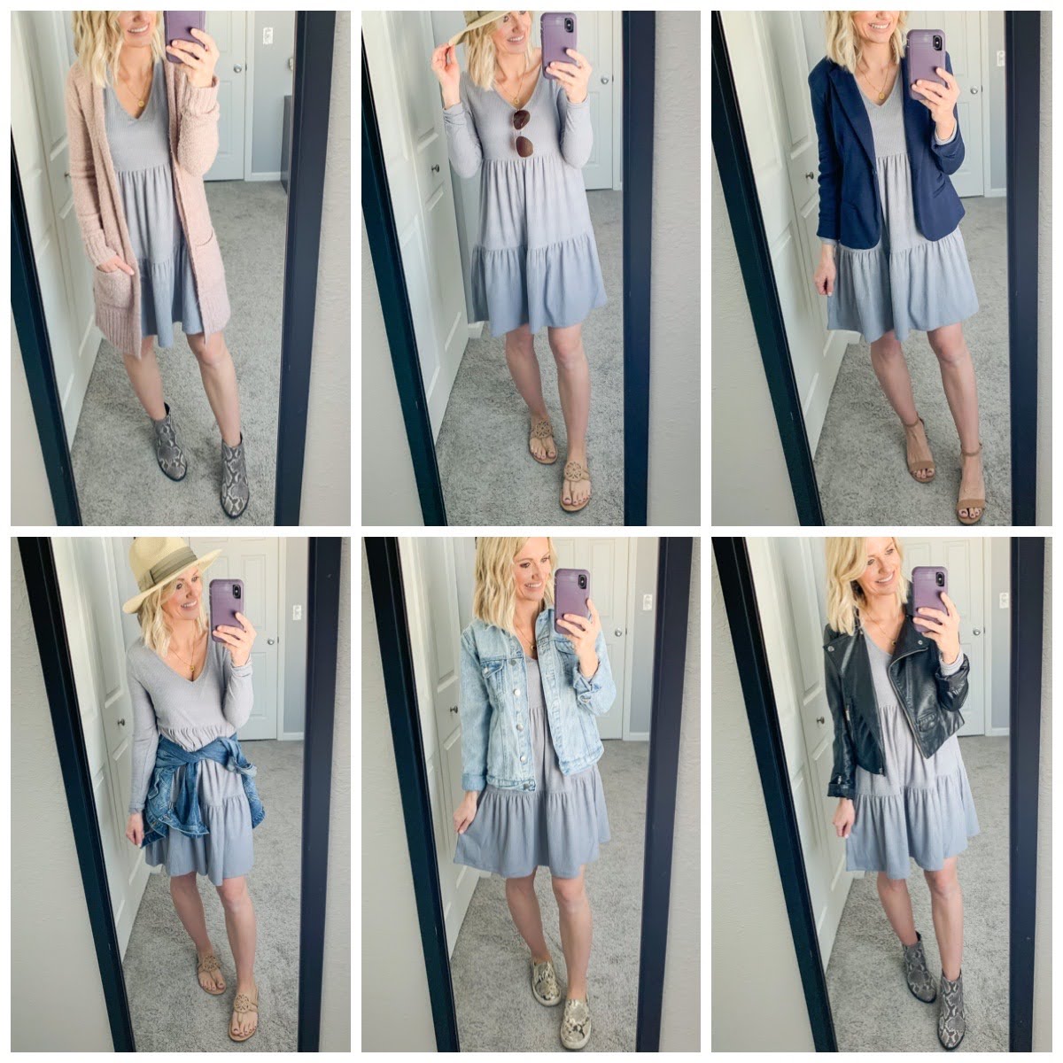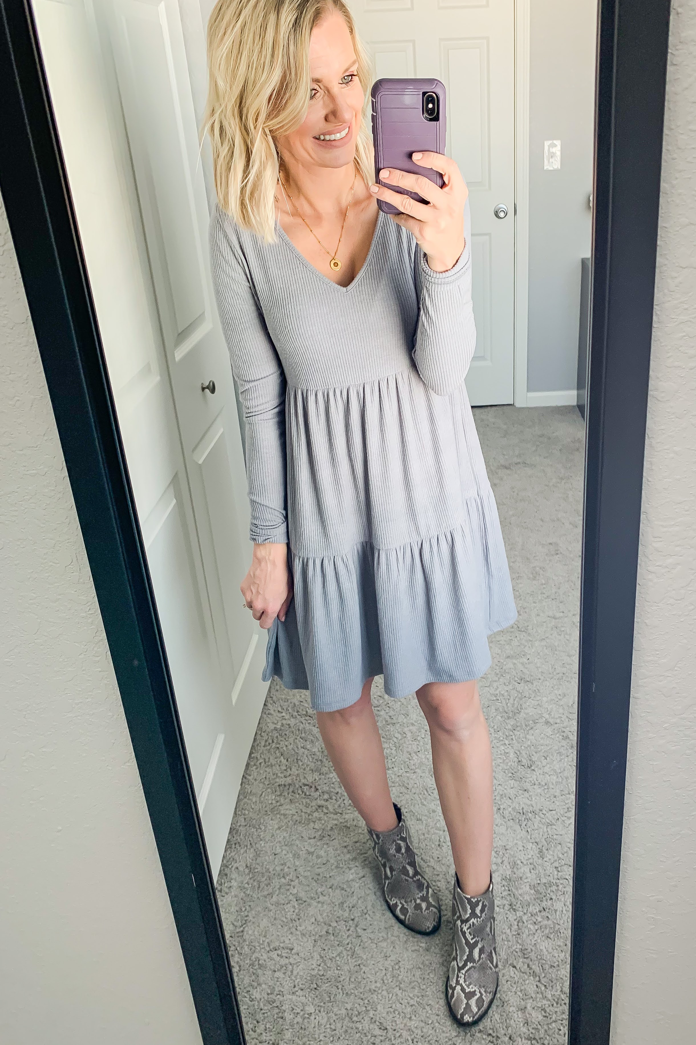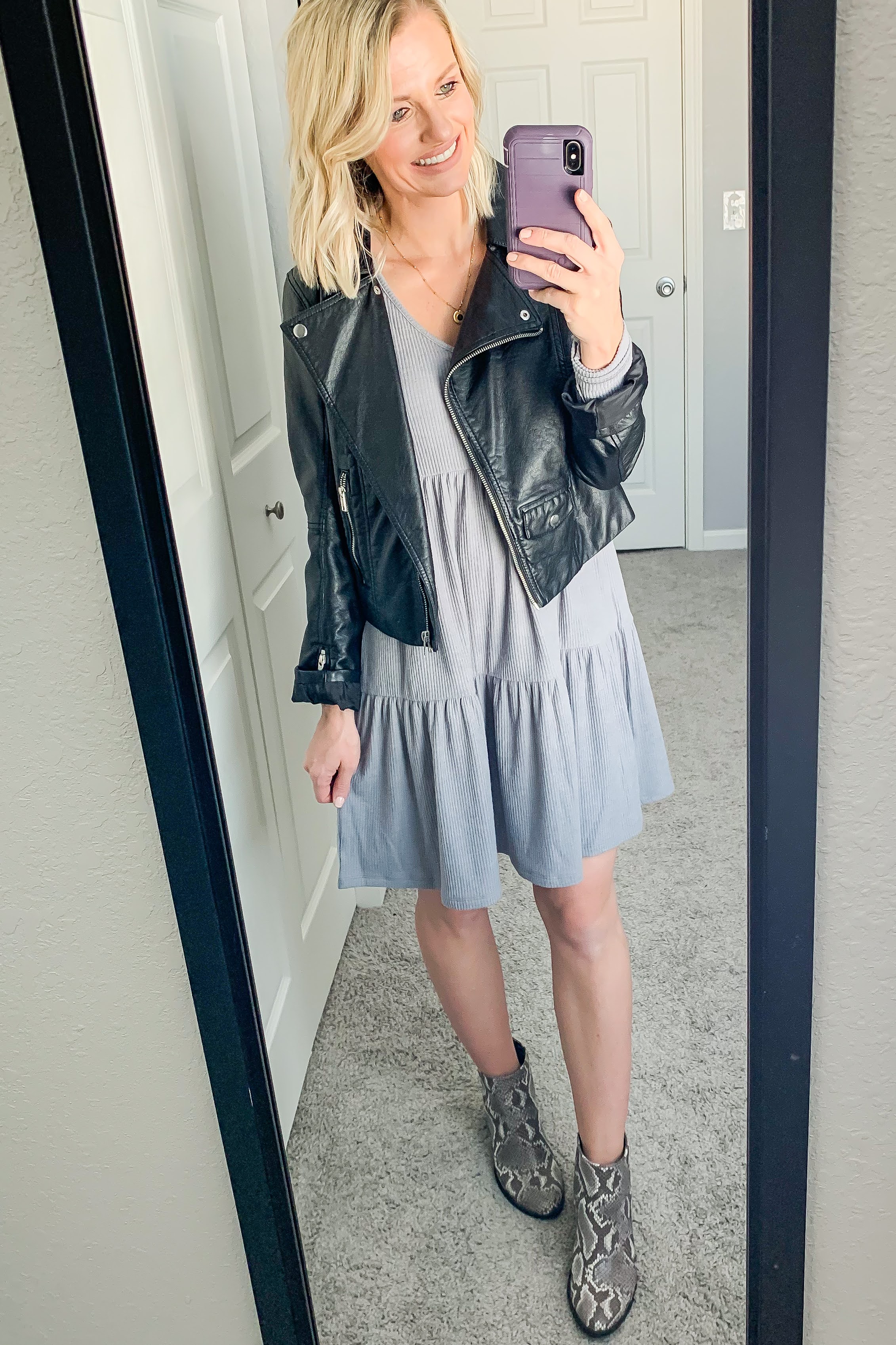 Booties are always great in the transitional seasons like spring. I styled it below with both my snakeskin booties and my black booties.  If it’s a chilly spring day you can add some tights or leggings to keep your legs warm.  If it’s warmer you can leave your legs bare.  What I really love about this dress is that it’s so cute on it’s own.  You can add a laying piece if you want, but it doesn’t need it.