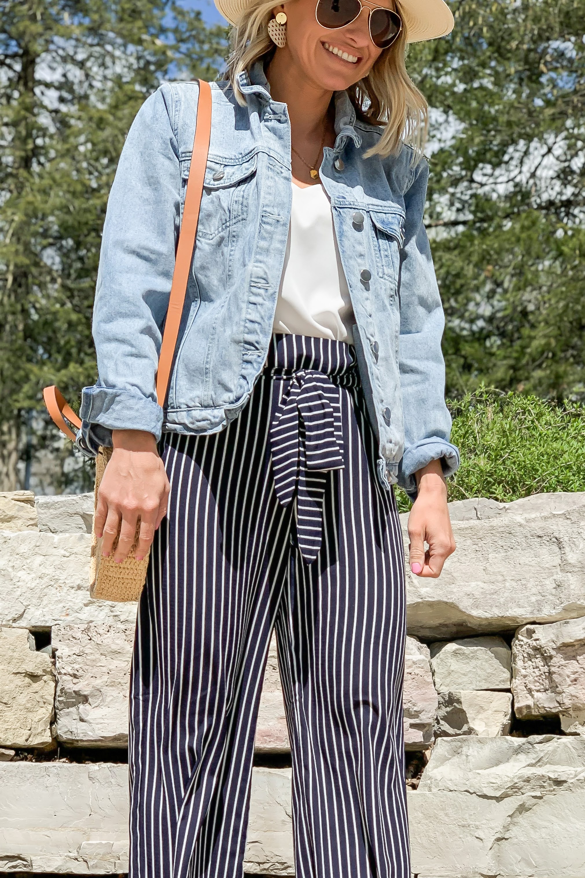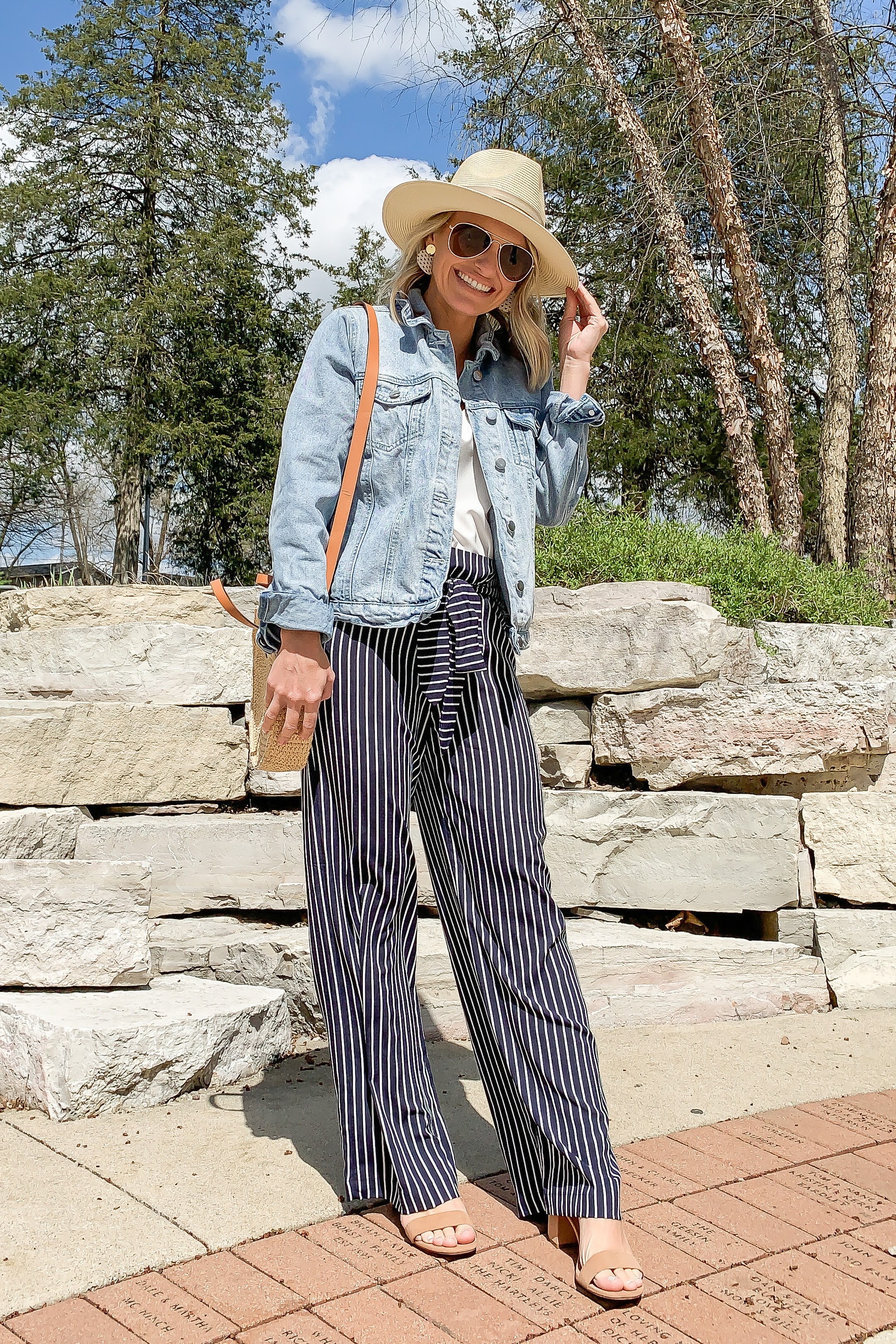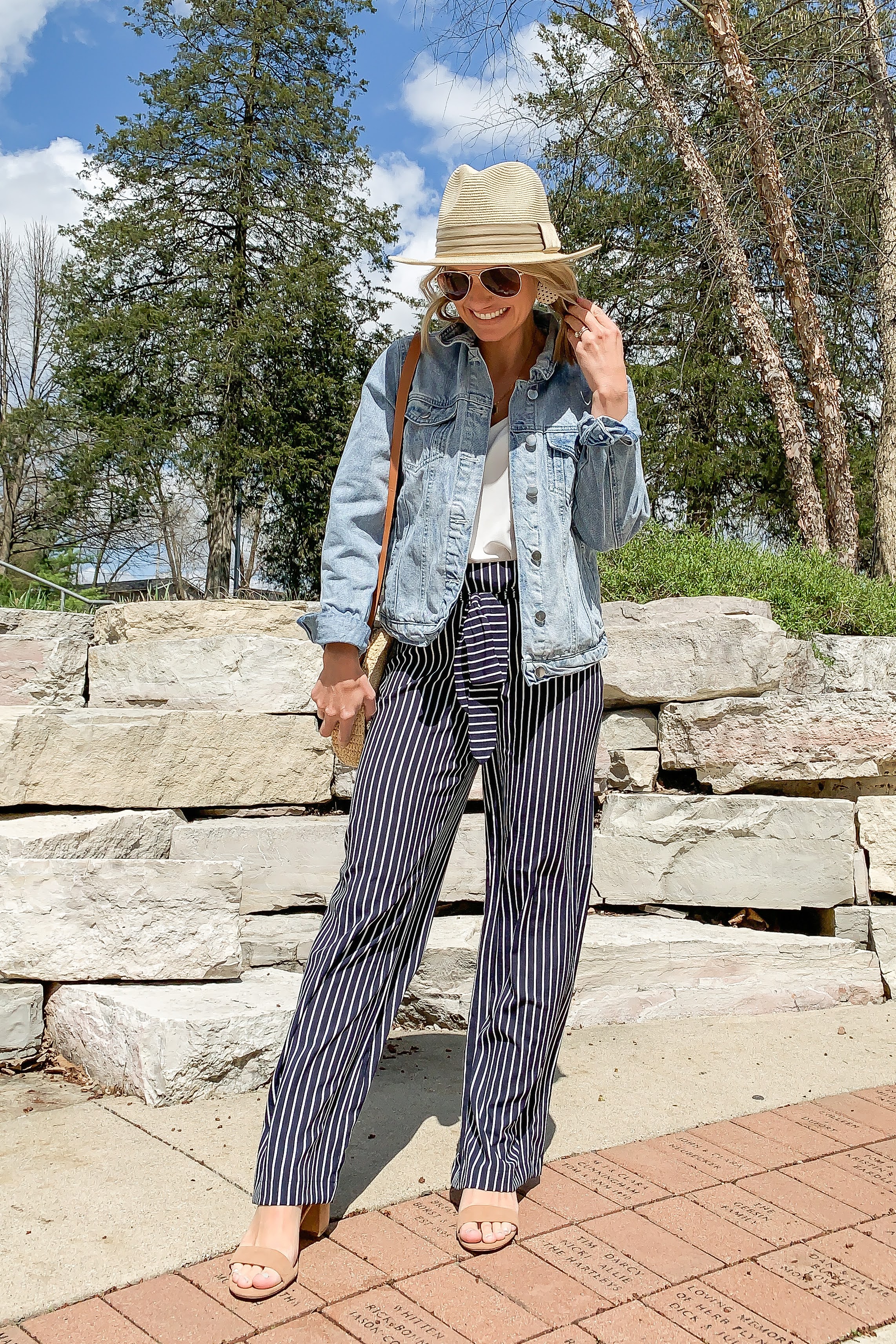 When I saw these Nautical Navy Striped Paper Bag Pants (code: THRIFTYWIFEHAPPYLIFE for 15% off) from Hometown Haven Boutique, I thought that they would be the perfect pair of pants to ease my way out of my lounge wear and into a more stylish pant. The great thing about these pants is that they are so comfortable, I feel like I’m still wearing my sweatpants when I wear them. If I was still working, these would be a go to pair of pants. Even without needing a work wardrobe I can still find plenty of places that I could wear these comfy flowy pants to.