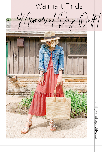 My favorite piece was this rust red color maxi dress. It’s so comfortable and perfect for summer! I can’t wait to wear it for all the red, white and blue holidays approaching this summer. I figured this would be the perfect look for Memorial Day this week! This dress is so easy to style. For todays look I wore it with my thrifted denim jacket, a straw hat, straw purse and my new strappy studded sandals, also from Walmart. This color is so perfect to accessorize with a little turquoise so I wore my Mediterranean stacked bracelets (Code: THRIFTYWIFEHAPPYLIFE for 15% off)