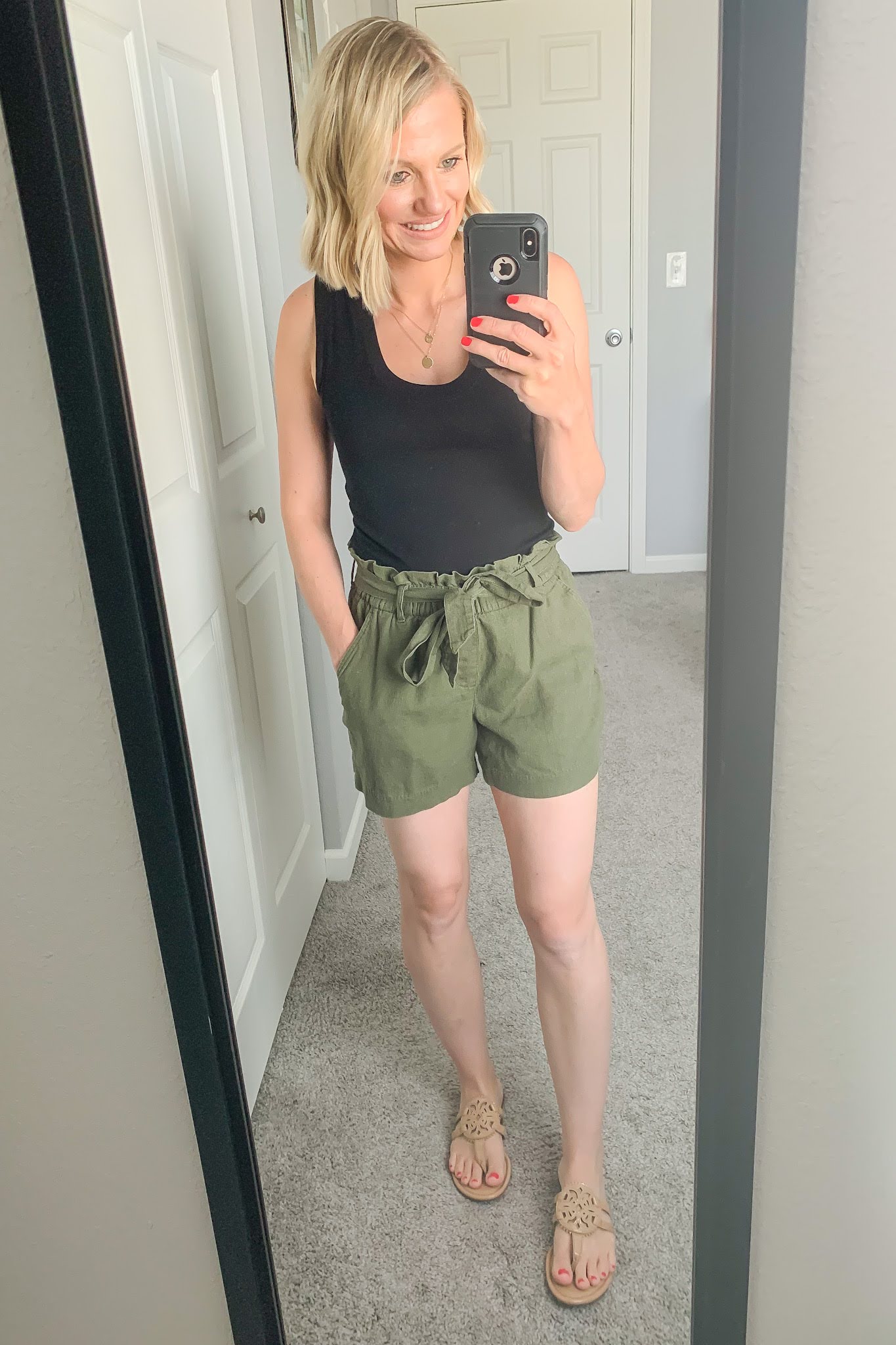I love the look of paper bag shorts with a fitted tank top. It is always an easy look. Green paper bag shorts always have a place in my wardrobe. I also have a pair of leopard shorts that I wear a lot too!