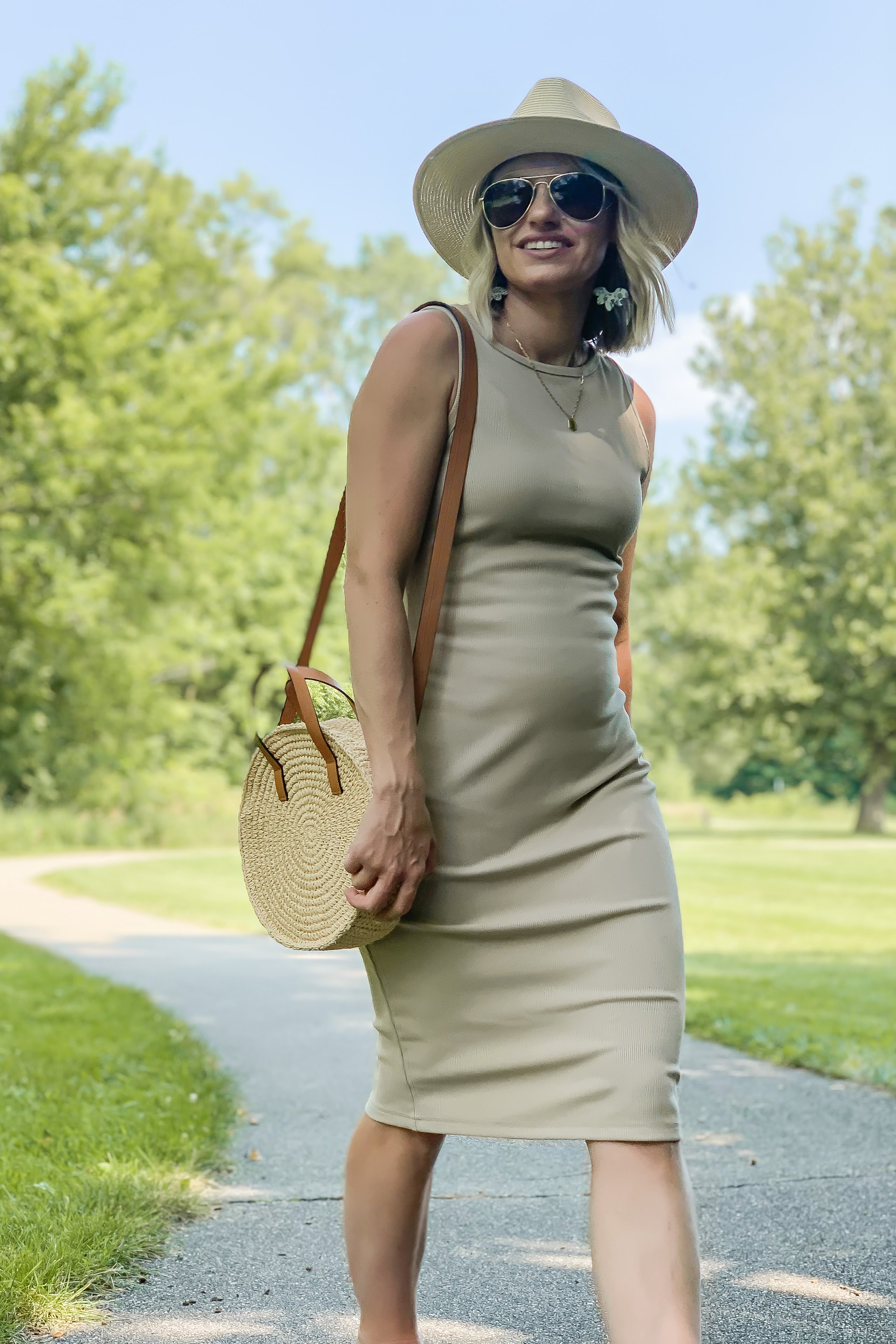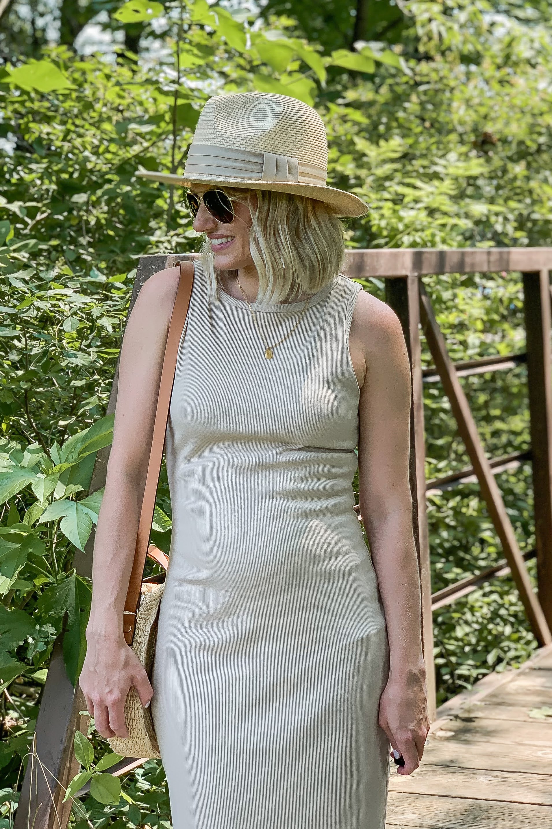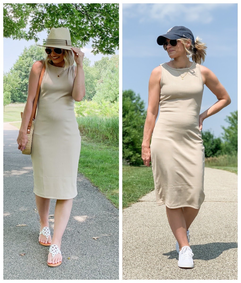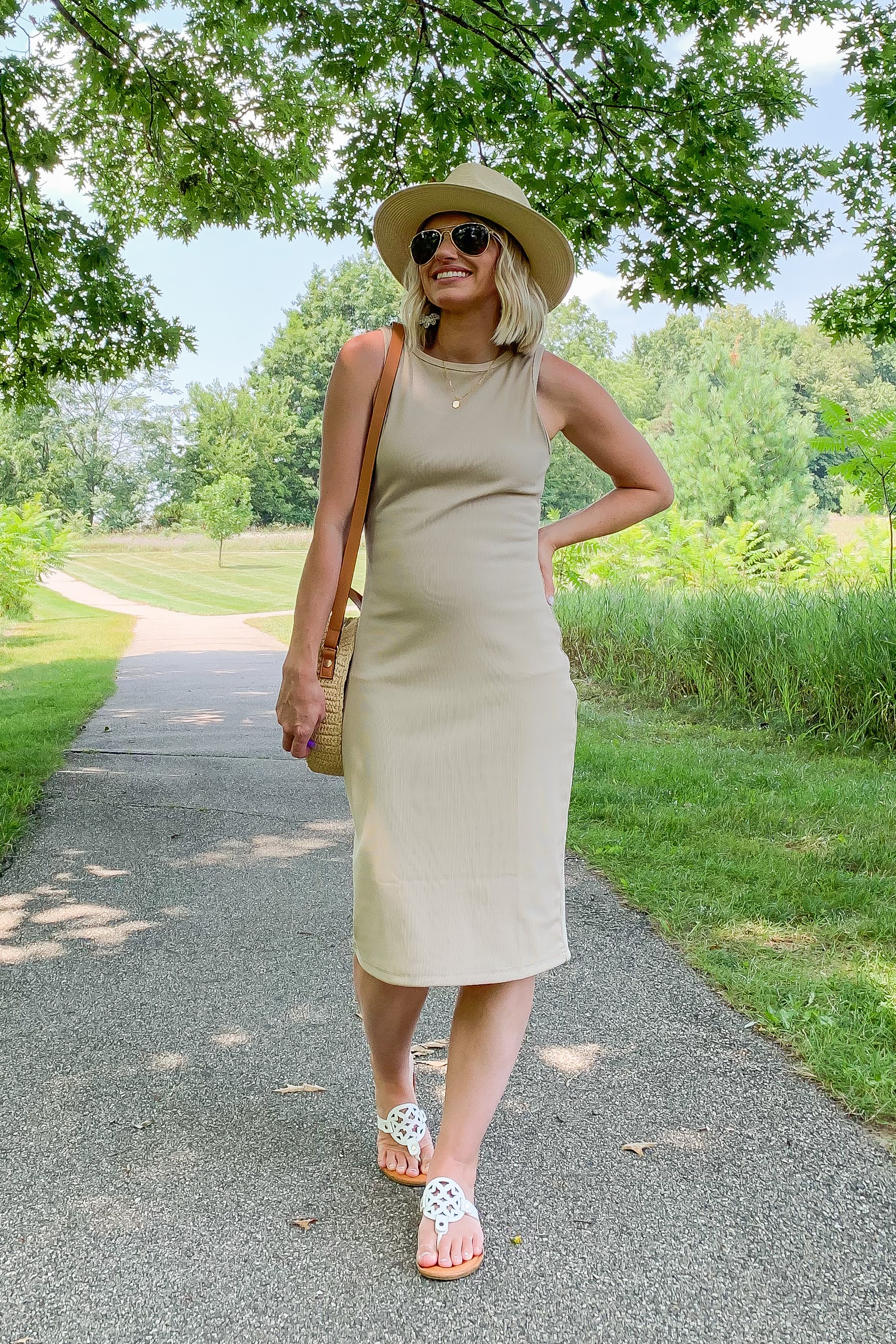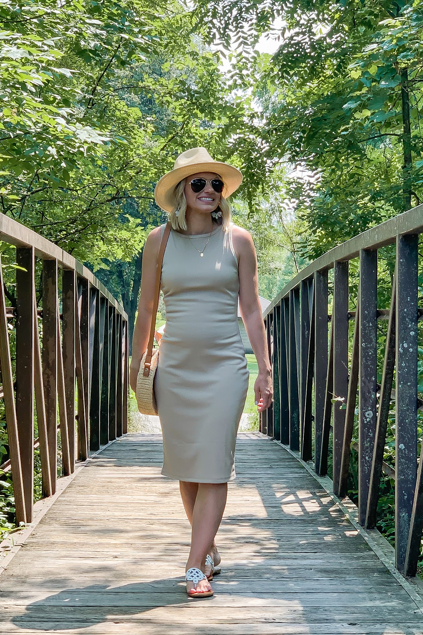As everyone has been shopping the Nordstrom Anniversary Sale the last couple of weeks, I have been shopping for look-a-like items from the sale for less. (You can check out all my favorite splurges and saves from my recent post HERE!!) One of my favorite items in the nsale was this neutral-colored cotton midi dress. I loved its style, so I knew I had to find a similar dress for less. I ended up finding this crew neck neutral-colored midi dress on Amazon for $13 less than the Nordstrom dress. I am so happy with my purchase. This dress fits perfectly! It’s true to size (I’m wearing a small) and it hits me at the perfect length, which is not always easy for me when buying midi dresses because I’m only 5’1. Most are either knee length or maxis on me.