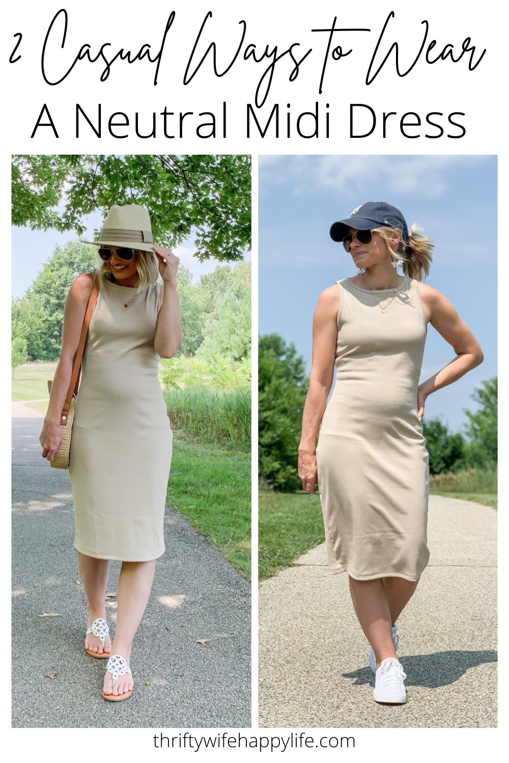 I know that a dress like this will stay in my wardrobe for a long time. I also know that I can style this dress in so many fun ways. Lately, I’ve mostly been wearing this dress in a very casual way because that’s just how life is right now for me. Very casual. Today I wanted to show you two easy casual ways that you can style this neutral dress.