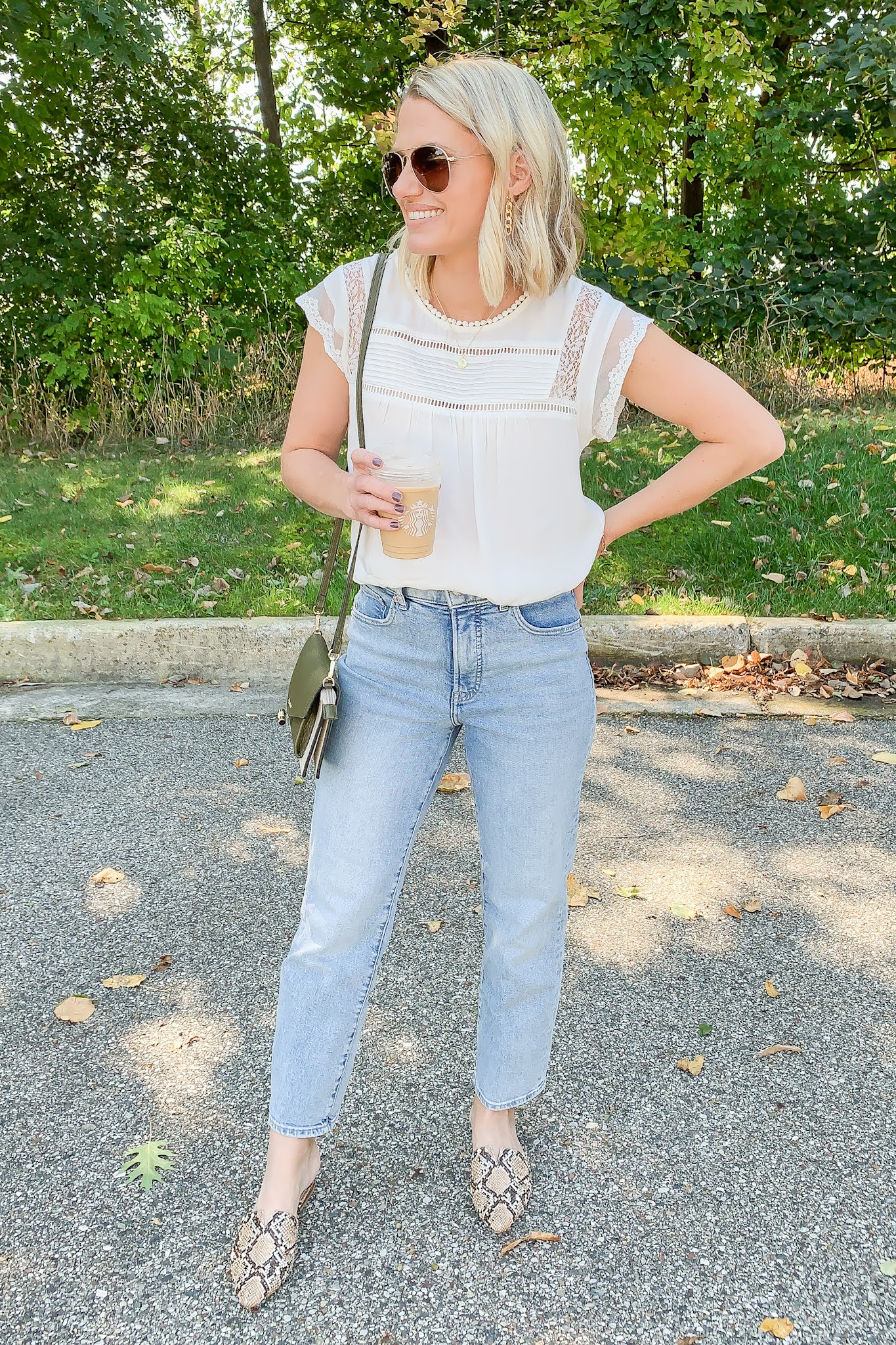 In my personal opinion, I think that any kind of shoe with a pointed toe is the most flattering type of shoe to wear with straight-leg jeans. Why? The pointed toe elongates your foot and legs. It thins you out and is just more flattering. I will often style my straight-leg jeans with my white sneakers. I prefer a sneaker with a shoelace over a slip-on sneaker, but it really just depends on the fit of the jeans. That is more my personal preference. This is probably the only round-toe shoe that I will wear with my straight-leg jeans. I also love to wear an opened-toe shoe with this style of jeans. Flip flops, sandals, block heel sandals, they all work. I think anything that exposes the ankle is the most flattering shoe. If you are planning on wearing booties, you definitely can, but I would wear a pair with a pointed toe that shows a little ankle.