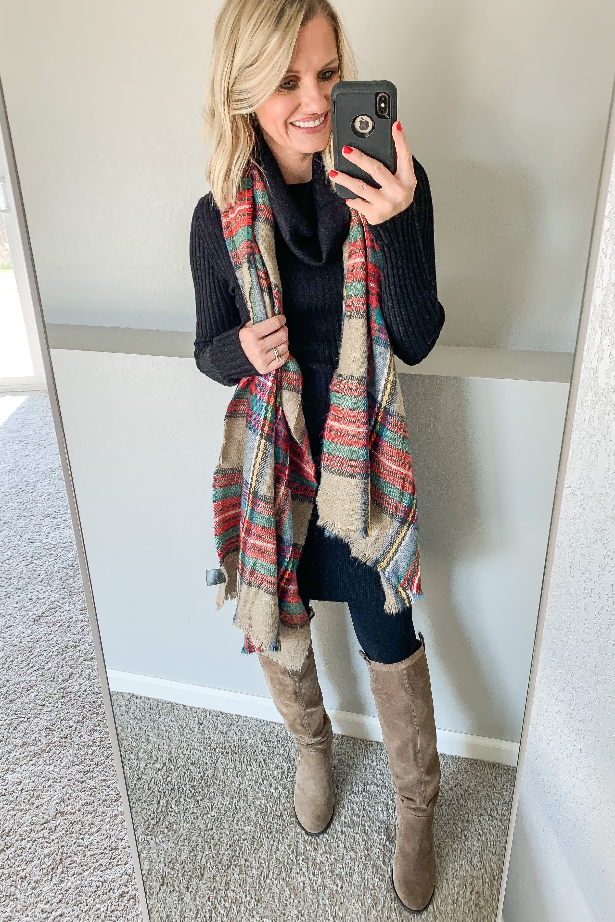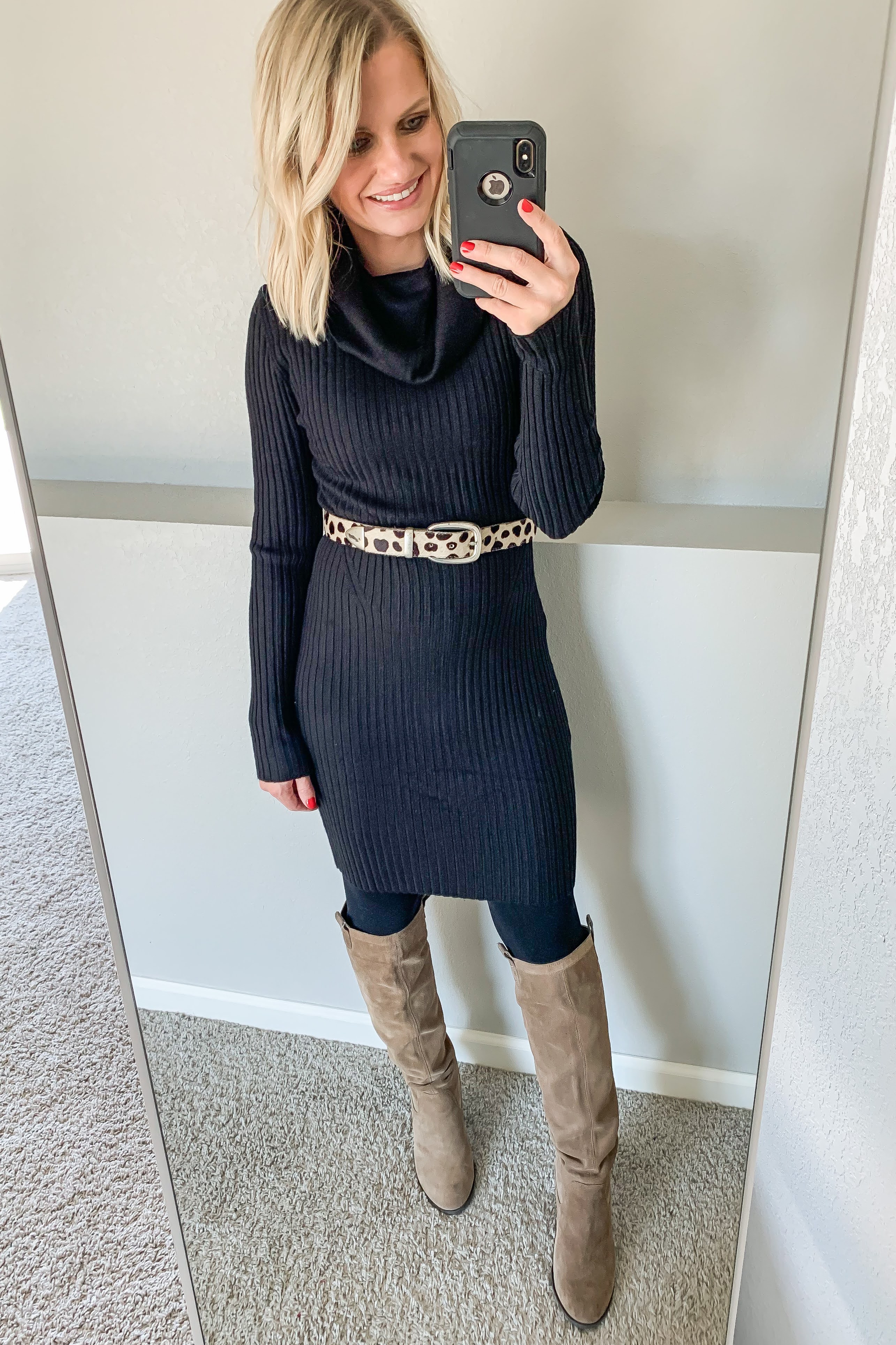 This dress has a fitted feel to it, which I really like. It is ribbed, which I think is flattering on most bodies. Instead of a turtleneck, it had a cowl neck, which is much looser than a turtleneck and doesn’t make you feel like you are in a neck brace. This dress fits true to size and also has a good length. I went with black because I thought it would be the most versatile color for fall and winter. Here is how I style my black sweater dress.