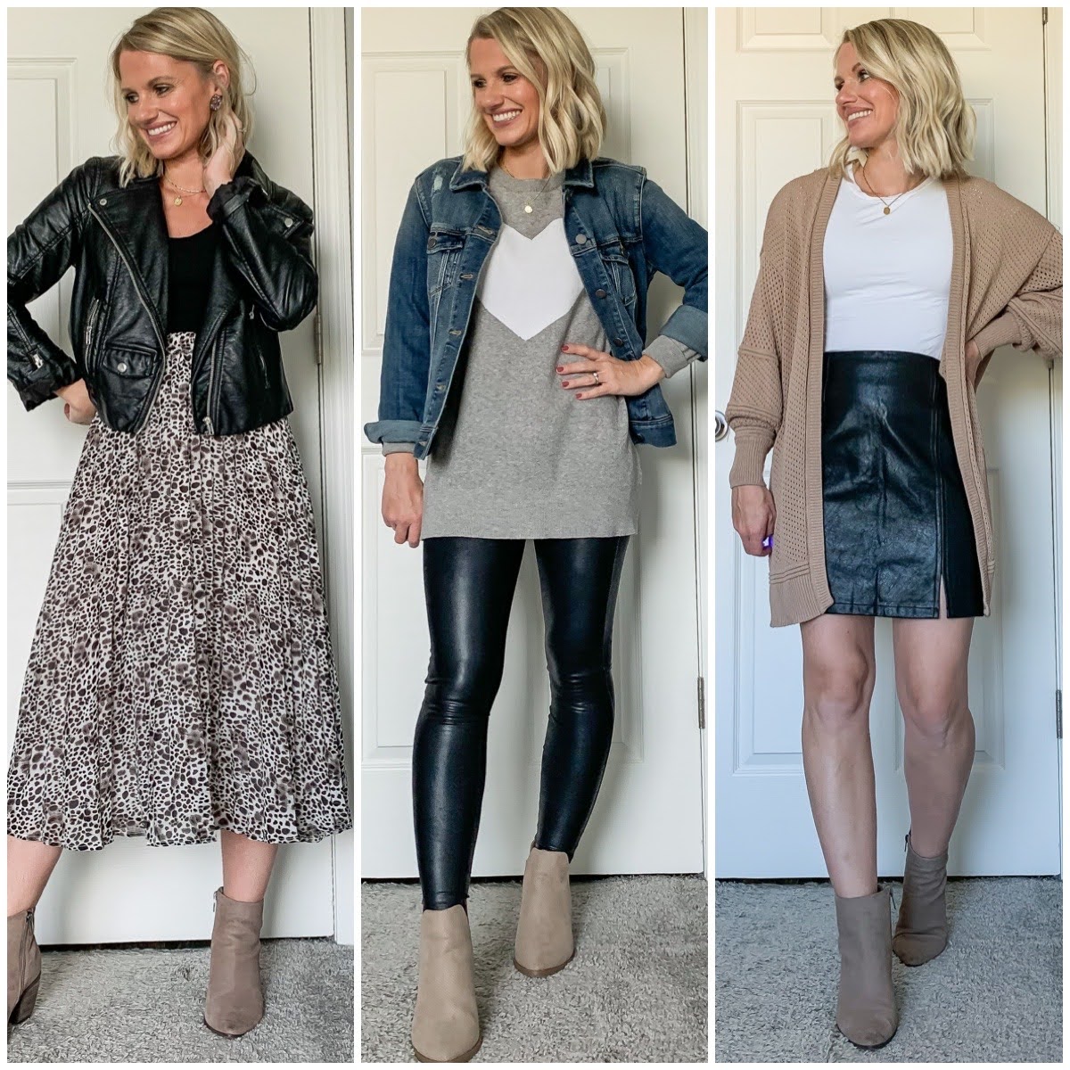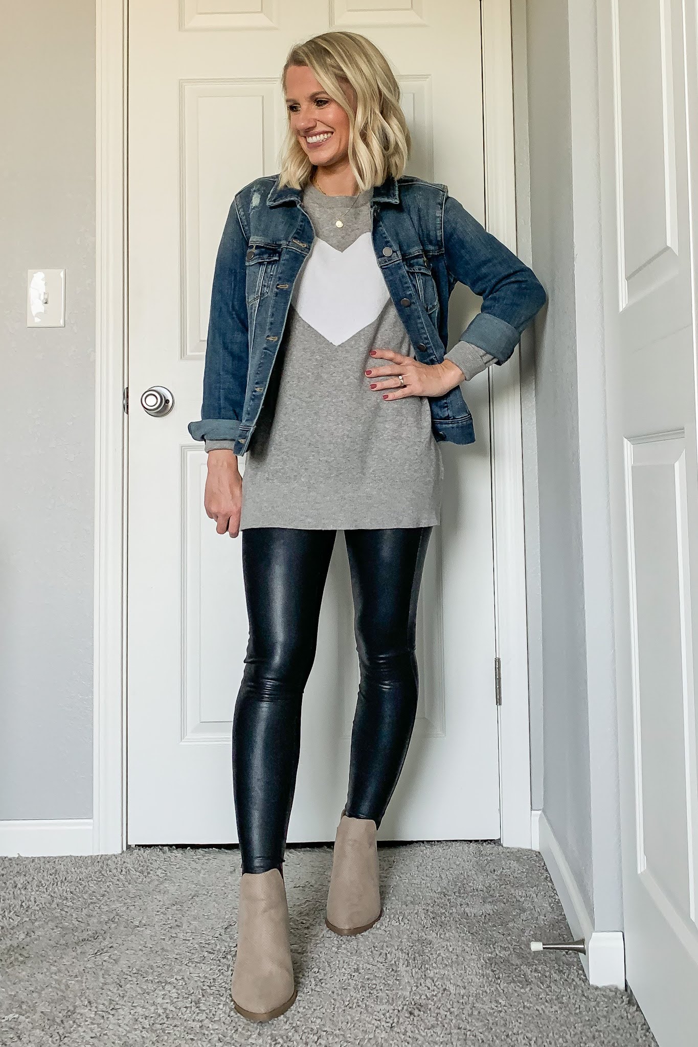 I wear my faux leather leggings at least twice per week. In the winter I wear black leggings a lot and I feel like the shiny finish on the leggings helps keep my legging outfits looking fresh and put together. I have 2 pairs. One I bought last fall at Aerie (similar HERE) and the other pair are the Spanx faux leather leggings HERE. You do not need to spend a lot of money on faux leather leggings, but you do need to find a decent pair. Make sure they are thick material, high-waisted, and fit well. I have tried on a lot of pairs of leggings that bunch up or hang off my legs, so finding the right fit is key.