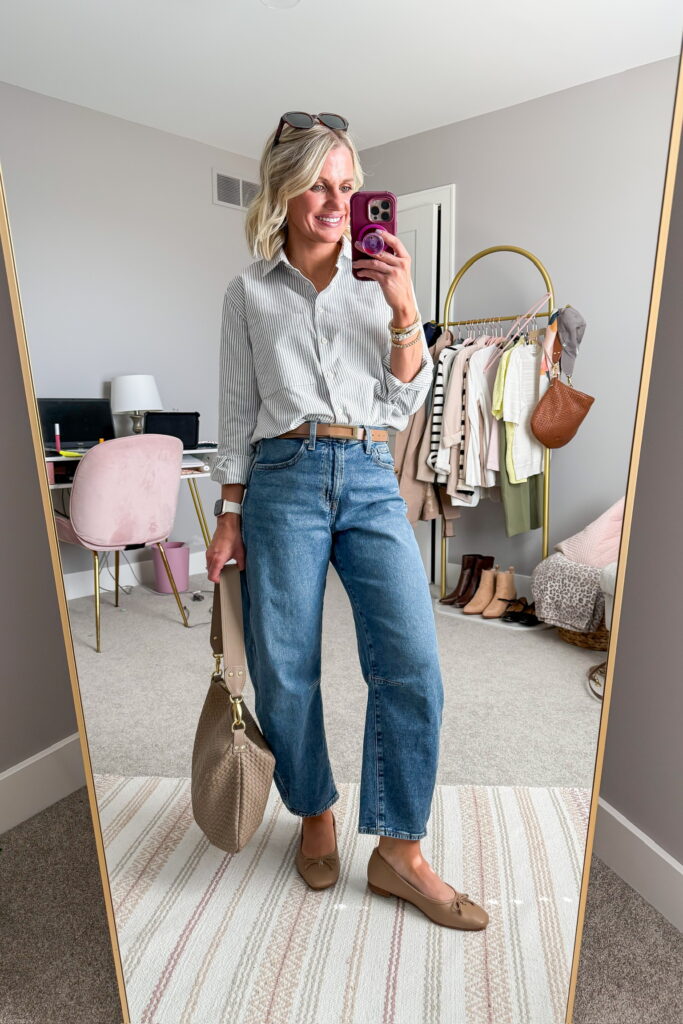 A classic Oxford button-down shirt is a staple in my wardrobe. It’s a timeless style, and I love how it pairs with barrel jeans. I accessorized this outfit with my tan belt, crescent purse, and ballet flats.